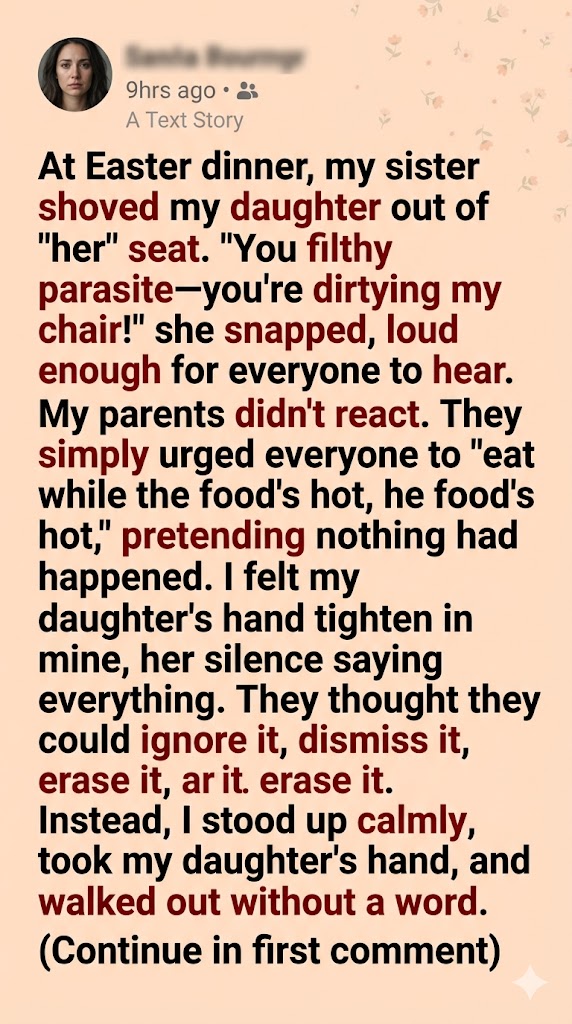 At Easter dinner, my sister shoved my daughter out of “her” seat. “You filthy parasite—you’re dirtying my chair!” she snapped, loud enough for everyone to hear. My parents didn’t react. They simply urged everyone to “eat while the food’s hot,” pretending nothing had happened. I felt my daughter’s hand tighten in mine, her silence saying everything. They thought they could ignore it, dismiss it, erase it. Instead, I stood up calmly, took my daughter’s hand, and walked out without a word. Once outside, I made a single call. My voice was steady: “Fire Elena.”