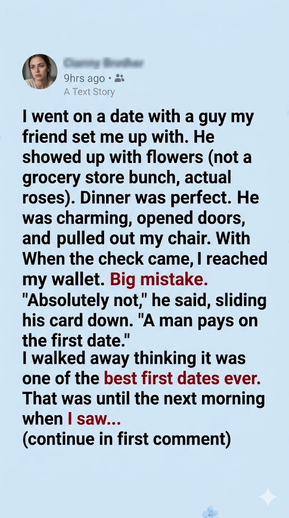 This was the same man who dramatically slid his card across the table and said, “A man pays on the first date.” The same man who refused to let me touch my wallet. The same man who made a whole speech about chivalry.