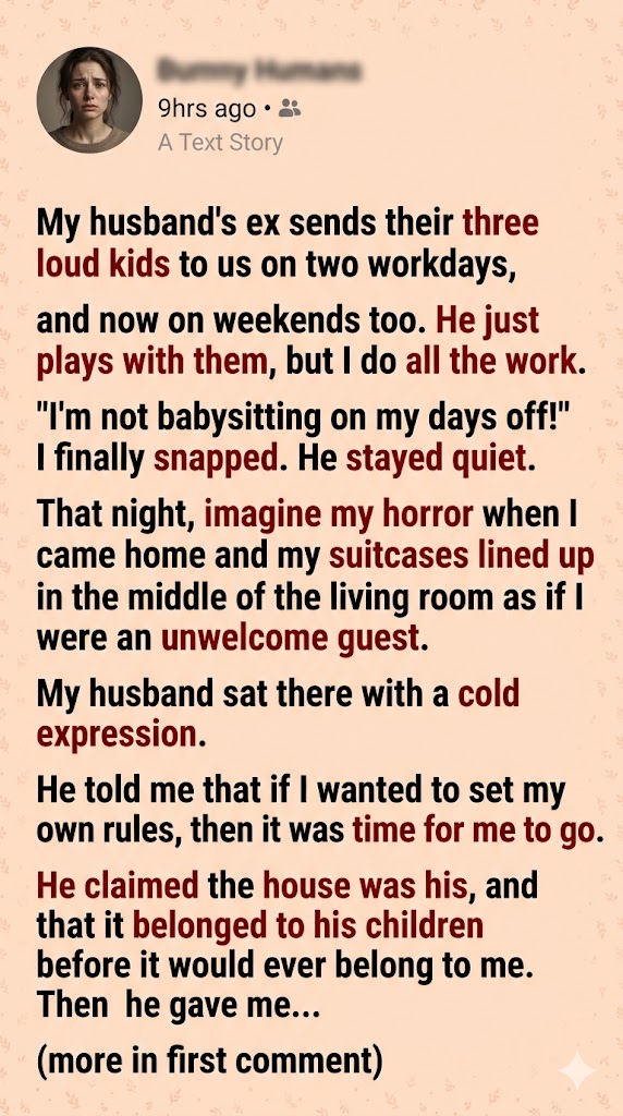 That night, imagine my horror when I came home and found my suitcases lined up in the middle of the living room as if I were an unwelcome guest. My husband sat there with a cold expression. He told me that if I wanted to set my own rules, then it was time for me to go. He claimed the house was his, and that it belonged to his children before it would ever belong to me.