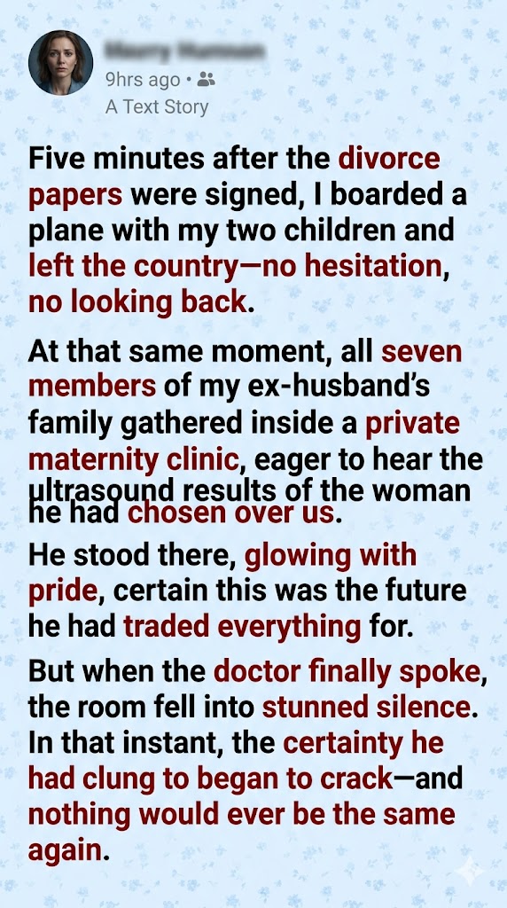 Five minutes after the divorce papers were signed, I boarded a plane with my two children and left the country—no hesitation, no looking back. At that same moment, all seven members of my ex-husband’s family gathered inside a private maternity clinic, eager to hear the ultrasound results of the woman he had chosen over us. He stood there, glowing with pride, certain this was the future he had traded everything for. But when the doctor finally spoke, the room fell into stunned silence. In that instant, the certainty he had clung to began to crack—and nothing would ever be the same again. The heavy, suffocating weight of the past twelve years completely lifted from my shoulders the moment the plane’s wheels left the tarmac, severing the final invisible chains that had tethered me to a life of endless compromises and broken promises. As the aircraft climbed higher into the limitless blue sky, I finally allowed myself to exhale, a long, shuddering breath that released a decade of accumulated tension.