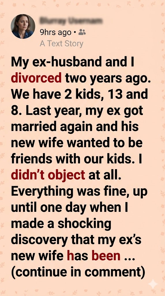 My ex-husband and I divorced two years ago. We have two kids, 13 and 8. Last year, my ex got married again and his new wife wanted to be friends with our kids.