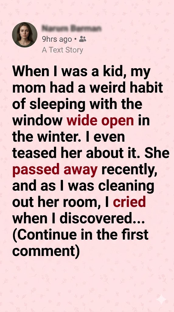 When I was a child, my mom had a habit that always puzzled me—she slept with the window wide open, even in the coldest winters. I used to tease her about it, bundling myself in blankets while joking that she must have been part polar bear. She would just smile gently and say, “Fresh air keeps the soul alive.” At the time, it felt like one of those strange, harmless quirks I would never fully understand.