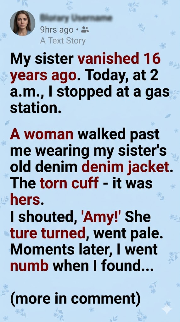 My sister Amy vanished when we were teenagers. No note. No explanation. Just an empty room and the denim jacket she always wore—the one with the frayed cuff she refused to fix.
