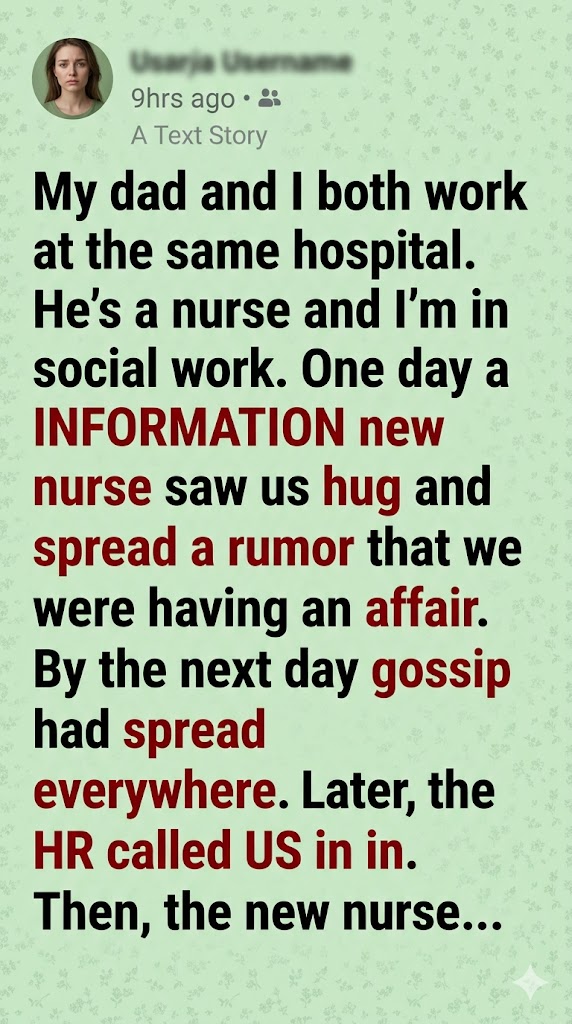 The spark that set everything off was a newly hired nurse who happened to witness one of those hallway greetings. She saw a senior male nurse and a younger female social worker share a brief embrace and, instead of seeing family, she assumed scandal. She didn’t know our last names. She didn’t know our history. She didn’t know how deeply our family was rooted in that building. She smiled politely as she walked past, but the misunderstanding had already taken hold. By the next morning, that single assumption had grown into a fast-spreading strand of gossip winding through the corridors.
