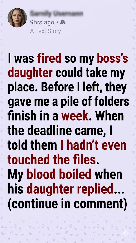 My desk was about to become hers. I accepted it with professional calm, even as my stomach twisted. Before I left, he handed me a stack of folders.“Could you finish these reports by next Friday?” he asked. “It would really help with the transition.” I nodded, took the folders, and walked out carrying a box of belongings and a storm of emotions I didn’t show. That week, I stared at the folders on my kitchen table.