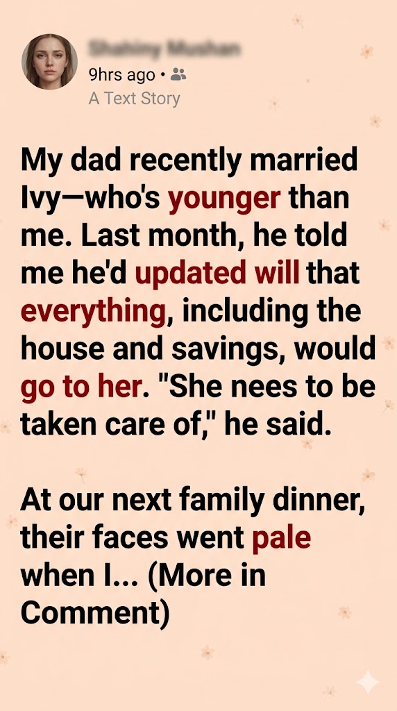 When my dad left everything to his new, younger wife, I chose not to fight it. At dinner, I shared that I had already built my own life and didn’t need his inheritance—only his happiness.