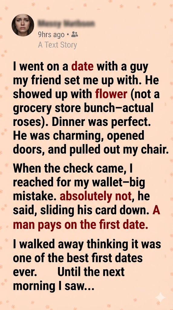 When Eric insisted on paying for everything—roses, a thoughtful gift, a perfect dinner—I thought I’d just had the best first date of my life. He checked every box: charming, attentive, confident. I went to bed smiling… completely unaware that the next morning, one message would flip everything upside down.