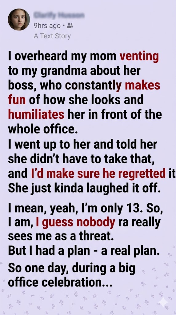 That night, Mom brushed it off, saying sometimes being strong meant staying silent. But I couldn’t. When she received an invitation to the company’s awards dinner, I convinced her to go, though she felt out of place. Secretly, I reached out to her boss’s daughter, Zoe, at school — and showed her recordings I’d made of her dad humiliating my mom.