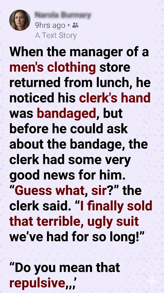 “Do you mean that repulsive, pink-and-blue, double-breasted thing?!” the manager asked.“That’s the one!”“That’s great!” the manager cried, “I thought we’d never get rid of that monstrosity! That had to be the ugliest suit we’ve ever had! But tell me, why is your hand bandaged?”