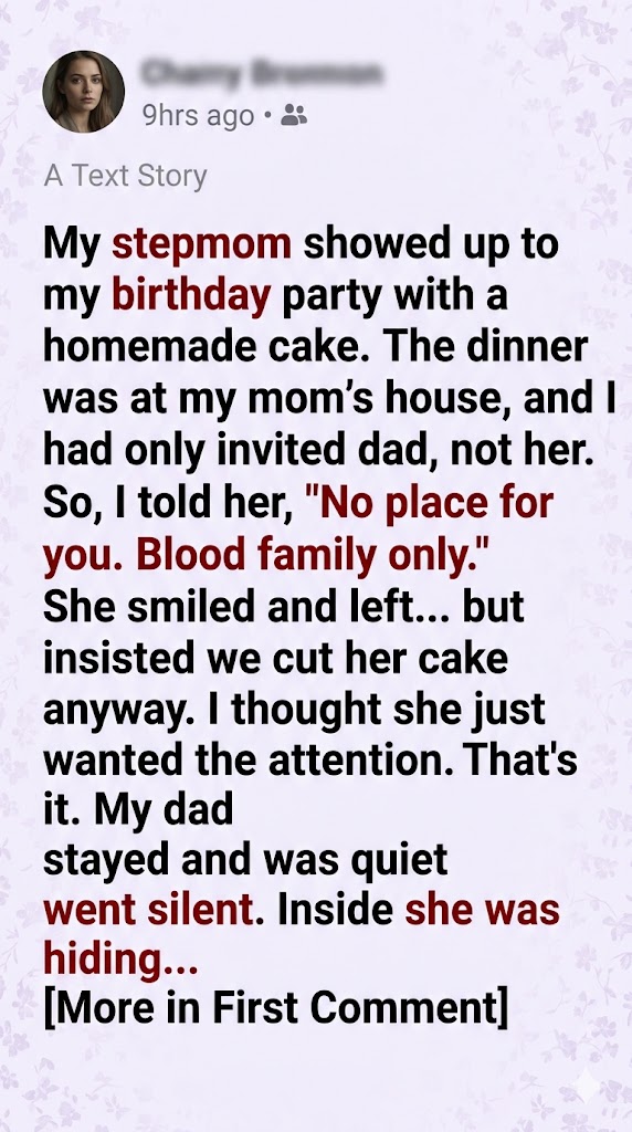 I had planned my birthday like someone trying to control the weather—carefully, obsessively, and with a quiet fear that something unpredictable might ruin it. In my mind, simplicity meant safety: just my closest family, no surprises, no emotional complications, and no blurred lines between past and present relationships. I wanted a calm evening where everyone knew exactly where they stood, especially when it came to my stepmom, whose presence in my life had always carried a complicated weight I never fully knew how to name. So when the day arrived, I thought I had done everything right. The table was set, the food was familiar, and I had mentally rehearsed how the evening would flow without awkward interruptions. But life rarely respects carefully drawn boundaries. The doorbell rang, and in that instant, before I even opened it, something in me already tightened. When I saw her standing there holding a homemade cake—slightly uneven frosting, soft edges, and a cautious smile—I felt a rush of emotions I didn’t pause to understand. She hadn’t been invited. That thought alone became louder than everything else. I remember how quickly I stepped into explanation instead of curiosity, telling her gently but firmly that tonight was meant for immediate family only. Her face didn’t change dramatically; instead, it softened in a way that made me feel both uncomfortable and strangely guilty. She simply nodded, placed the cake on the table near the entrance like it deserved to exist even if she didn’t, wished me a happy birthday, and asked if we could share it later. Then she left. I told myself I had handled it correctly, that I had protected the evening from confusion, but something about the way she walked away stayed lodged in my mind longer than I expected.
