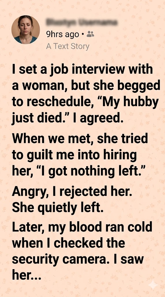 I set a job interview with a woman, but she begged to reschedule, “My hubby just died.” I agreed. When we met, she tried to guilt me into hiring her, “I got nothing left.” Angry, I rejected her. She quietly left.