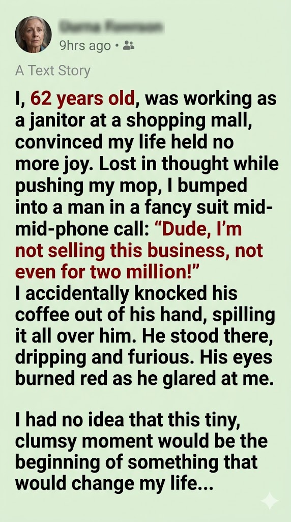 I was backing up with my mop bucket when I bumped straight into him, knocking the coffee cup right from his hand. The hot liquid splashed all over his expensive suit, staining the front of his jacket and dripping down his pants.