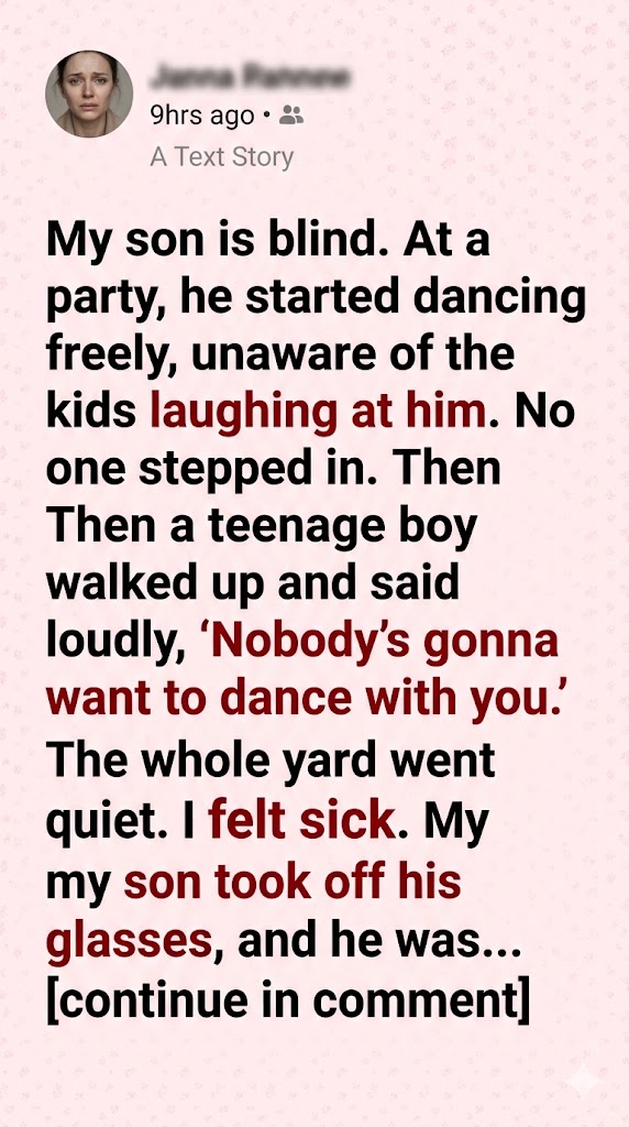 My son froze. His hands stopped mid-air. Slowly, he reached up and took off his glasses—the small, familiar gesture he always made when he was overwhelmed. His chin trembled just slightly.