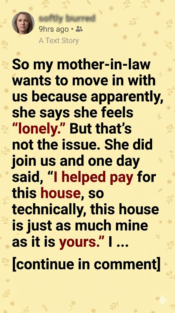 So my mother-in-law wants to move in with us because apparently, she says she feels “lonely.” But that’s not the issue. She did join us and one day said, “I helped pay for this house, so technically, this house is just as much mine as it is yours.” I blinked twice. I thought I’d misheard. But she looked me right in the eye as if daring me to argue. My husband, Bryan, just sat there sipping his coffee like she hadn’t dropped a grenade into the kitchen. A silence followed so heavy it felt like the air itself was waiting for someone to explode.