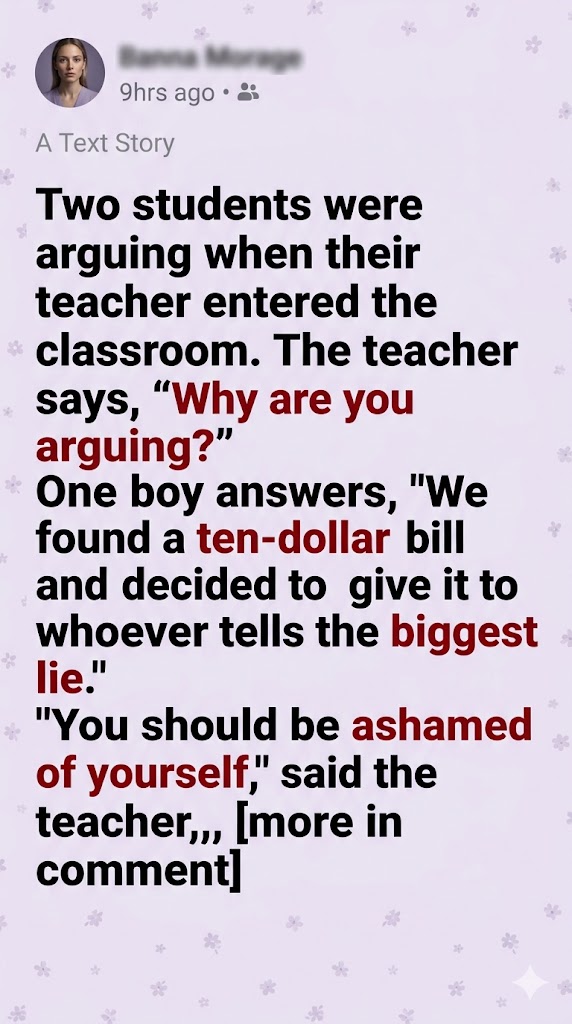 Two students were arguing when their teacher entered the classroom. The teacher says, “Why are you arguing?”One boy answers, “We found a ten-dollar bill and decided to give it to whoever tells the biggest lie.”
