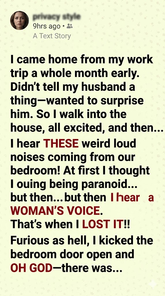 I came home a month early, dreaming of pasta, candles, and a warm embrace. Instead, I found two kids on my rug, strumming my ukulele like it was junk, and my husband looking like he’d seen a ghost. “Kim?