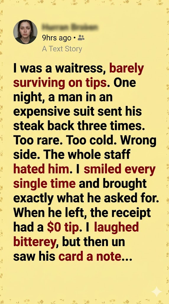 I still remember the exact weight of that tray in my hands—the way my fingers ached from balancing too many plates, the way my smile felt glued on after a twelve-hour shift that wasn’t even close to over.
