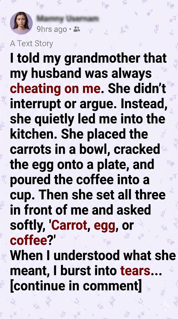 “He’s cheating on me again,” I said after a long silence, my voice dull from saying those words too many times. “I forgave him before. I tried to understand. I kept telling myself that marriage means patience, that love means staying even when it hurts. But I’m so tired, Grandma. I feel stupid for still being there, and I feel weak because I don’t even know how to leave.”