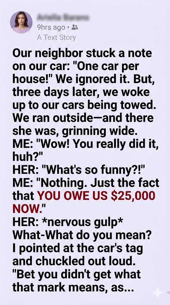 The tow operator said the removal had been based on an HOA complaint. Lindsey claimed she had given us fair warning. That’s when Jack pointed out the official government identification stickers on our vehicles. The driver immediately hesitated, stepped back, and made a phone call.