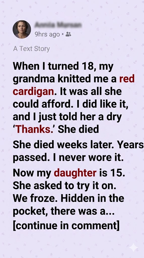 Years slid by — graduation, marriage, children, bills, all the small details that fill a life until memory becomes a quiet hum beneath the noise. I saw the cardigan sometimes while rearranging things — a flash of red amid forgotten scarves — but I never unfolded it. It belonged to another time, another version of me. Or so I told myself.