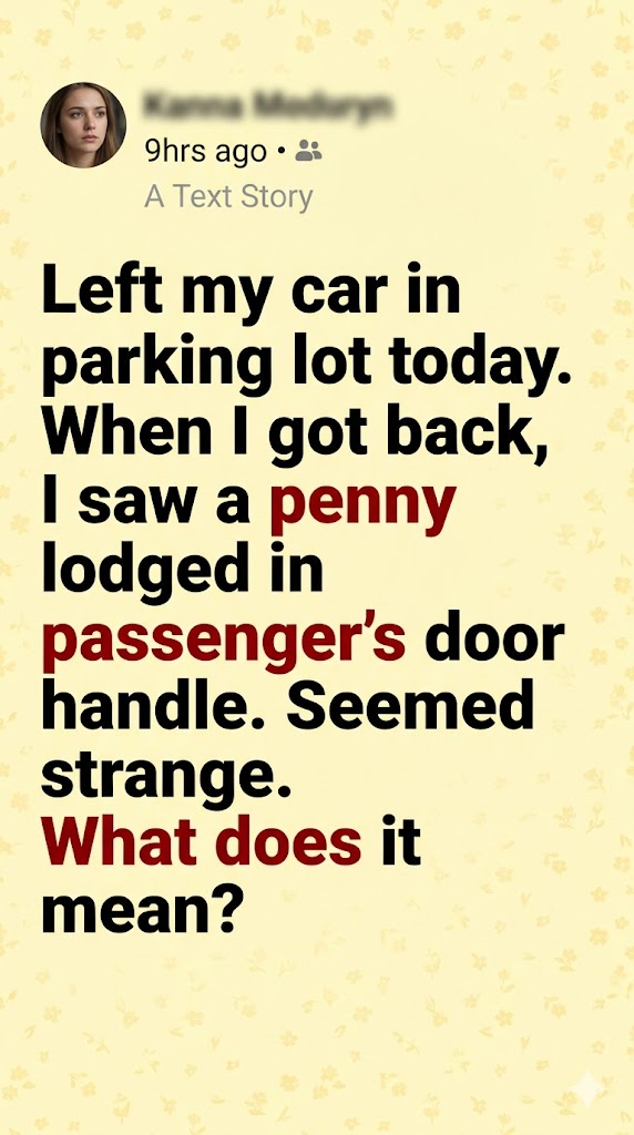 Discovering a lone penny carefully lodged in the passenger-side door handle of your vehicle after a routine day of parking can instantly shift a mundane moment into one filled with questions, unease, and speculation. The image circulating online captures this exact scenario with the caption describing the odd find, prompting countless drivers to wonder whether it is mere coincidence, an innocent accident, or something far more calculated. In parking lots across cities and suburbs, where thousands of cars sit unattended for hours, small anomalies like this stand out sharply against the background of everyday life. The human mind, wired to detect patterns and potential threats, often leaps from a simple coin to elaborate theories involving crime, superstition, or even personal messages from the universe. This phenomenon has fueled discussions on social media platforms, forums, and even prompted advice from law enforcement and automotive experts. To truly understand what such a discovery might signify, it is essential to explore the practical mechanics of how a penny ends up there, the persistent urban legends that surround it, the psychological impact on the finder, real-world safety considerations in public parking environments, cultural and symbolic interpretations of coins, and finally, balanced strategies for responding without succumbing to unnecessary fear while maintaining prudent vigilance.