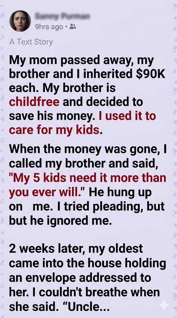When Mom passed, everything felt like it was moving underwater—slow, heavy, unreal. Then came the will, the lawyer’s office, the quiet reading of numbers that somehow reduced a lifetime of love into neat figures.