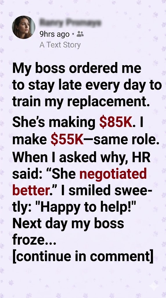 It all started on a gray Tuesday afternoon when my boss summoned me into her corner office overlooking the parking lot where I had parked my ten-year-old sedan every morning for the past six years. She leaned back in her leather chair with that practiced smile she reserved for delivering bad news wrapped in corporate jargon and told me the company had decided to bring in a replacement for my position effective in two weeks. The replacement a woman named Sarah would be earning eighty-five thousand dollars annually while I had been grinding away at fifty-five thousand in the exact same role handling the same client accounts managing the same quarterly reports and troubleshooting the same software glitches that kept the entire department afloat. I felt my stomach drop but I kept my face neutral as she explained that I would need to stay late every single evening to train her properly no excuses no overtime pay beyond the standard rate because it was simply part of my job description. The words echoed in my head as I walked back to my cubicle past the water cooler where colleagues whispered about the latest round of budget cuts. That evening I sat at my desk replaying the conversation and decided to visit HR the next morning to ask why this disparity existed after all my years of loyalty and consistent performance reviews that always landed in the top tier. The HR representative a middle-aged man with a name tag that read Mark adjusted his glasses and delivered the line that would ignite everything she negotiated better as if that single phrase explained away years of my contributions my late nights my skipped vacations and my willingness to cover for others when deadlines loomed. I nodded politely because arguing would only mark me as difficult and instead I smiled sweetly and said happy to help knowing that my compliance would buy me the time I needed to set my plan in motion. Over the following days I arrived early and stayed until the office lights flickered off one by one documenting every detail of my daily tasks in a private notebook that I kept hidden in my bag the exact procedures for reconciling accounts the hidden shortcuts in the database software the client preferences that no one else bothered to remember and the unspoken rules that kept the team from falling apart. Each night as I drove home through the quiet streets of my neighborhood I reflected on how this company had taken advantage of my dedication while rewarding negotiation skills I never knew I needed to learn and I promised myself that this training would not end with me being pushed out quietly. My family noticed the extra hours and the tension in my voice during dinner but I reassured them that this was temporary that I was handling it and inside I began to feel a quiet power building as I realized that knowledge was my greatest asset and I would use it not just to train Sarah but to protect myself and expose the unfairness that had been staring me in the face for so long.