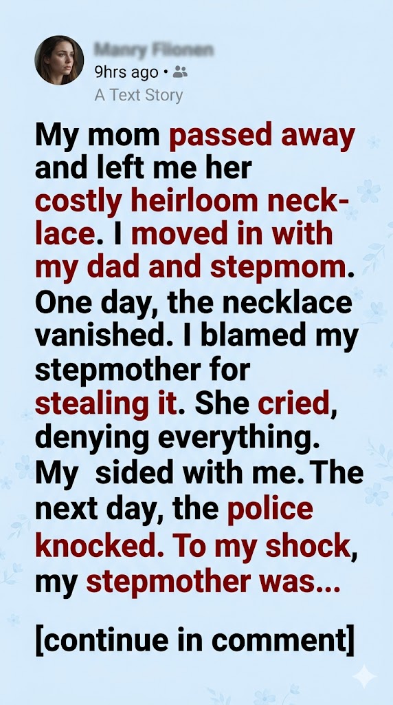 When my mom died, the world dimmed in a way I didn’t know how to fix. The only thing that still felt like her was the heirloom necklace she left me—an intricate gold pendant passed down through generations. I guarded it like a piece of my own heart.