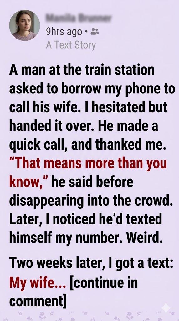 I was waiting for my train when a man approached me—middle-aged, tired eyes, suit wrinkled like he’d slept in it. He cleared his throat and asked softly, “Could I borrow your phone to call my wife? Mine just died.”