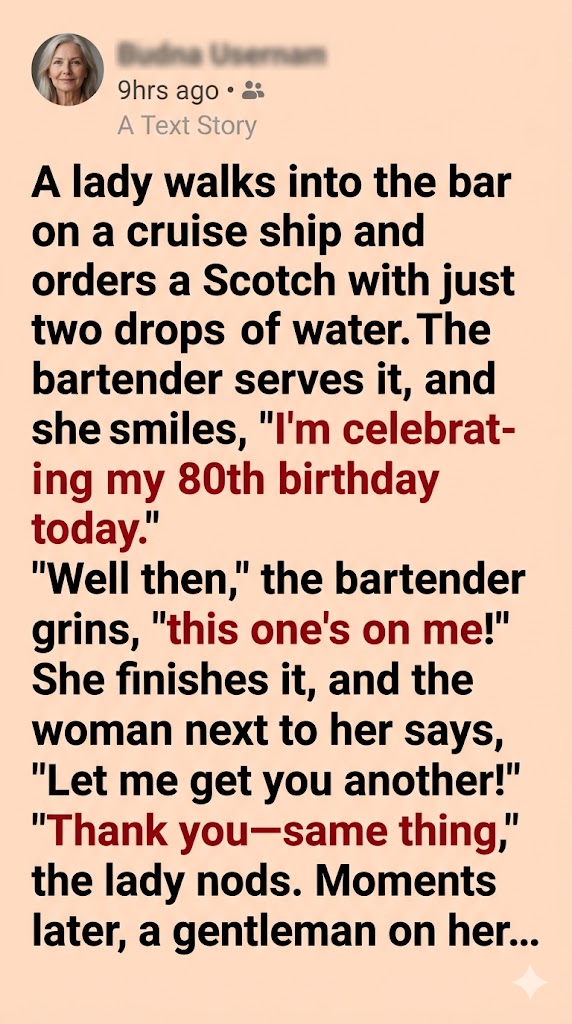 Now the bartender leans in, curious. “Ma’am, I have to ask… why only two drops of water?”