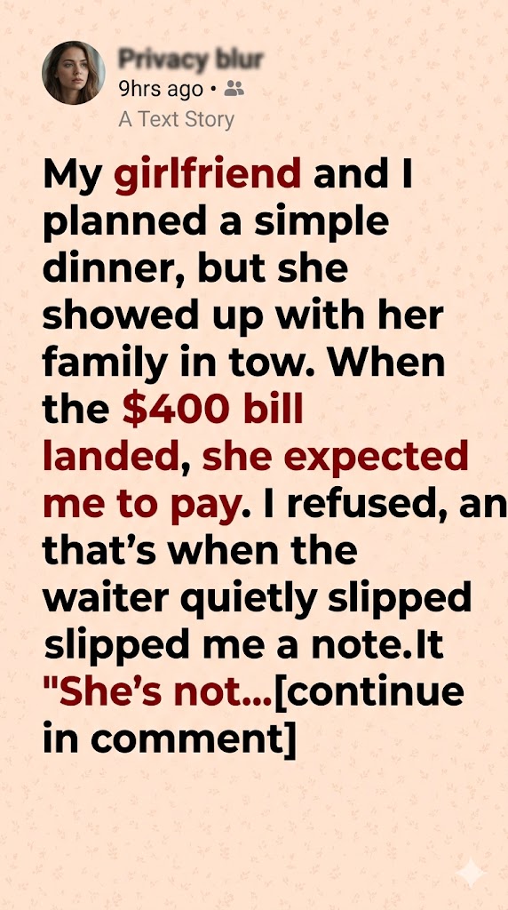 I took it as a good sign. In my mind, meeting family meant seriousness, honesty, a step forward. She mentioned—more than once—that it would really impress them if I paid for dinner. I didn’t think much of it. I assumed it would be her parents, maybe a simple, slightly awkward meal. Paying for a few extra plates felt like a small price for a good first impression.