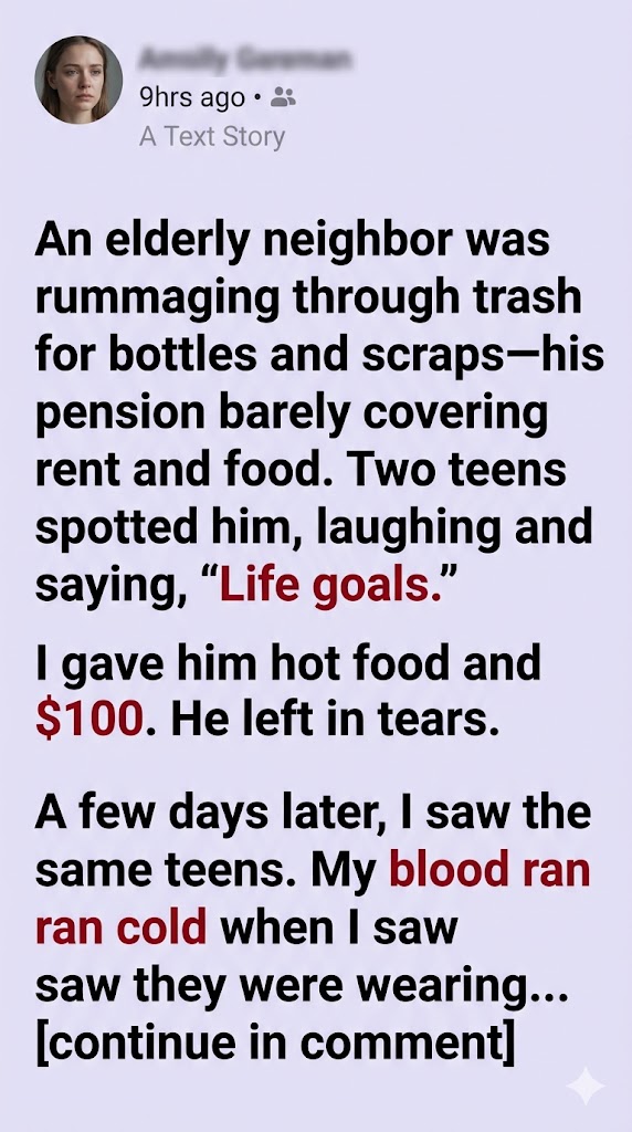 Every evening around dusk, when the streetlights flickered on and the city softened into that strange mix of exhaustion and calm, he would appear by the dumpsters behind our apartment building. His coat was always the same faded brown, too thin for the season, and his hands trembled slightly as he sorted through bags of trash.