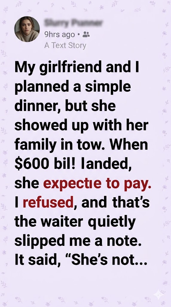 Nothing extravagant. Just a quiet Friday night at a mid-range restaurant downtown. We’d both had long weeks, and I thought it would be a nice chance to unwind, talk, and maybe discuss the next step in our relationship. We’d been together almost a year. I was starting to think about the future.