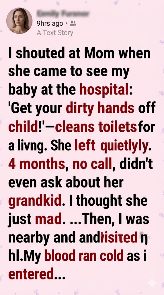 At the time, I felt justified. Exhausted. Overwhelmed. Ashamed in ways I didn’t know how to name. My mother cleaned toilets for a living—office buildings, train stations, anywhere that needed someone invisible to scrub away other people’s messes. I had spent years pretending that didn’t bother me. But there, in that pristine hospital room, holding my perfect baby, all my buried resentment spilled out in one unforgivable sentence.
