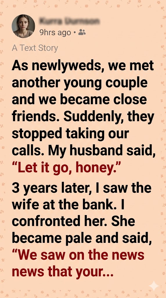 As newlyweds, we met another young couple and quickly became close. We shared dinners, weekends, inside jokes, and dreams about the lives we were just beginning. Then one day, they stopped answering our calls. My husband brushed it off—“Let it go, honey”—but the suddenness left a bruise I never fully understood.