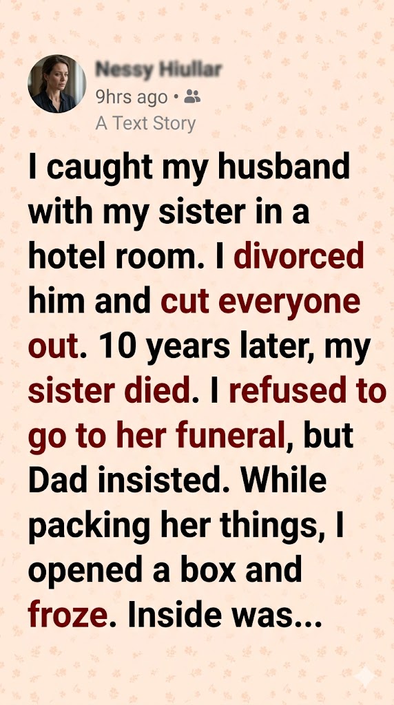 I once walked in on my husband and my sister in a hotel room. That instant shattered everything I thought I knew. I divorced him, cut off my sister, and carried the silence for ten long years. When she passed away, I refused to attend her funeral—until my father insisted I go.