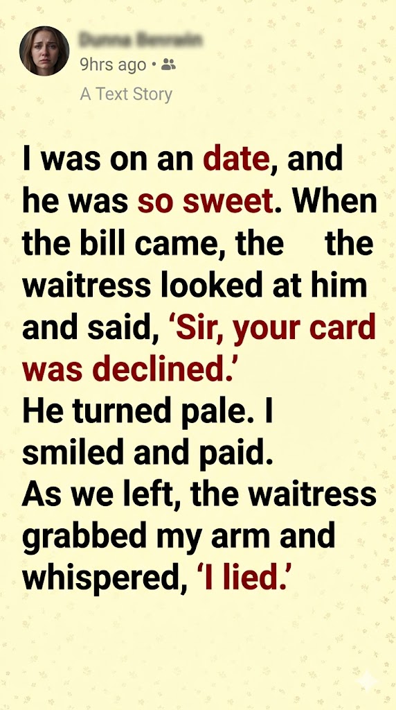 On a sweet first date, everything felt perfect—until the waiter approached and said my date’s card had been declined. Embarrassed, I paid the bill.