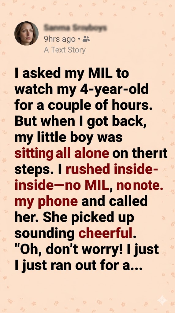 But when I got back, my stomach sank. My little boy was sitting all alone on the front steps, holding his favorite stuffed dinosaur. He smiled when he saw me, but I was in shock. Where was my MIL? I rushed over, checking him from head to toe. He was okay, just looking a bit puzzled. “Grandma said she’d be right back,” he told me.