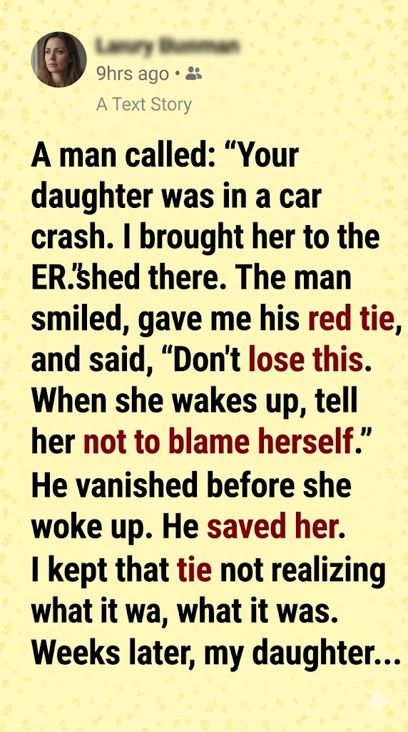 The man approached me then. His eyes were steady, his smile faint but strangely reassuring. He reached into his pocket and pulled out a red tie, neatly folded. He pressed it into my hand. “Don’t lose this,” he said softly. “When she wakes up, tell her she did the right thing. Tell her not to blame herself.”