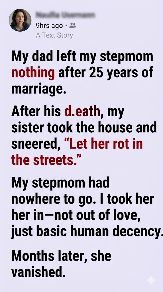 After twenty-five years of marriage, my stepmother, Sandra, was left with nothing. No savings. No property. Not even the house she had lived in for half her life. My father had quietly put everything in my sister’s name years earlier. I watched Sandra sit there, hands folded in her lap, her face perfectly still as the lawyer spoke. She didn’t cry. She didn’t argue. She just nodded once, as if she had expected it all along.