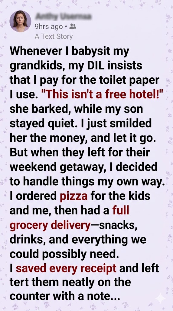 Whenever I babysit my grandkids, my daughter-in-law insists I pay for things I use—even toilet paper. “This isn’t a free hotel,” she once snapped, while my son stood there in silence. I didn’t argue. I just smiled, handed her the money, and let it go.