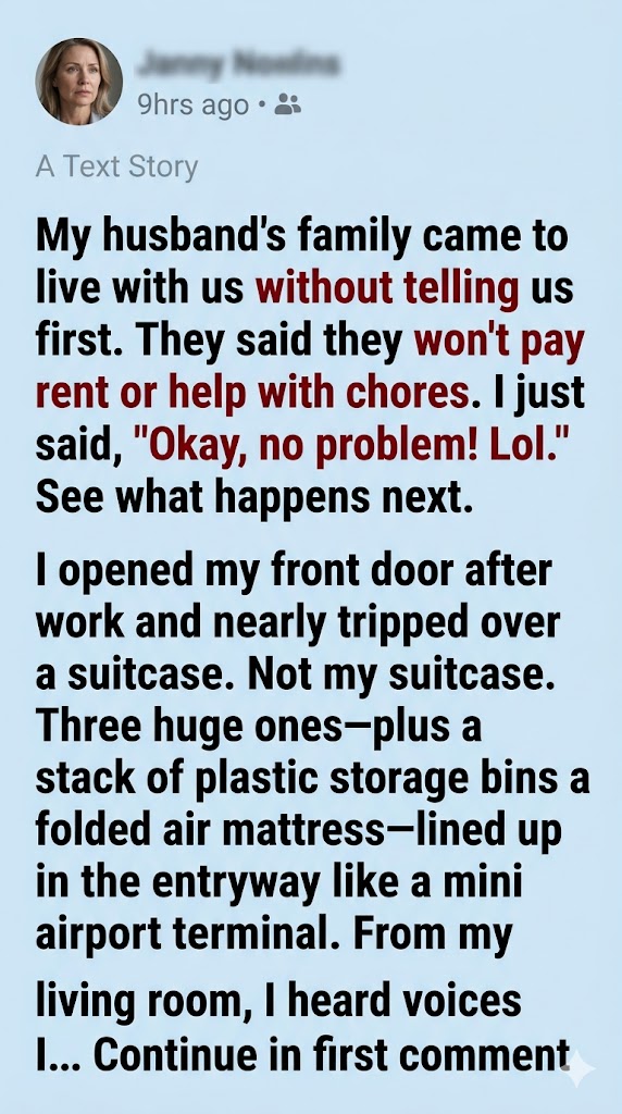 My husband’s family came to live with us without telling us first. They said they won’t pay rent or help with chores. I just said, “”Okay, no problem! Lol.”” See what happens next.