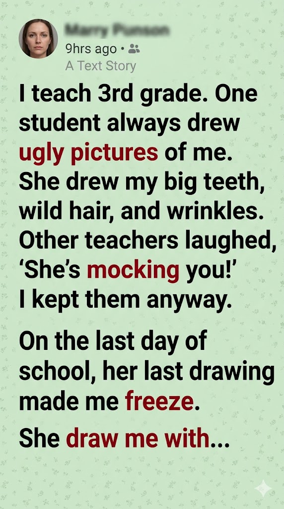 I teach 3rd grade. One of my students always drew pictures of me—big teeth, wild hair, wrinkles. Other teachers joked, “She’s mocking you!” I laughed it off, but something told me to keep every single one.