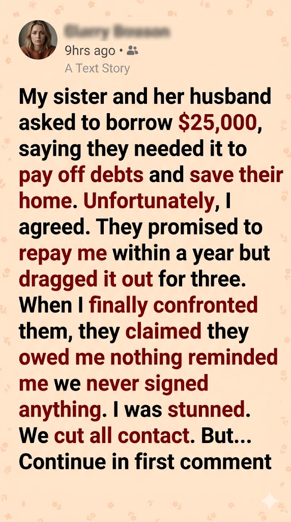 My sister and her husband begged to borrow $25,000, claiming they’d lose their home. I had saved it for years, but when she called in tears, I agreed.