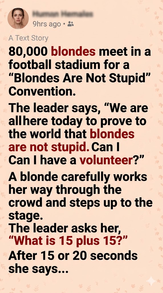 A blonde carefully works her way through the crowd and steps up to the stage. The leader asks her, “What is 15 plus 15?” After 15 or 20 seconds she says, “Eighteen!”