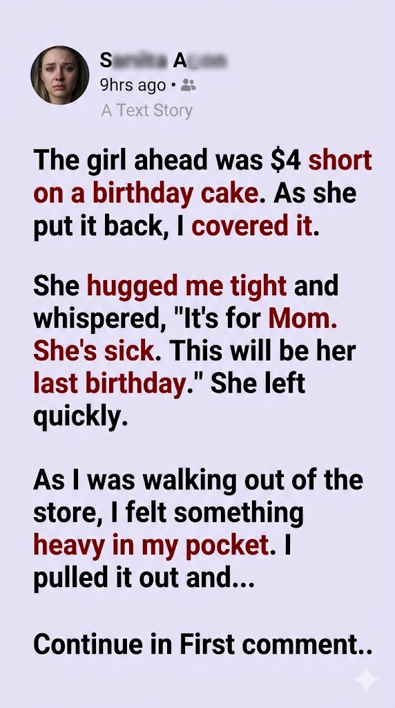 The grocery store was quiet when I noticed a young girl, maybe ten years old, holding a small birthday cake. When she reached the register, she realized she was a few dollars short. Her face fell as she quietly set the cake aside.