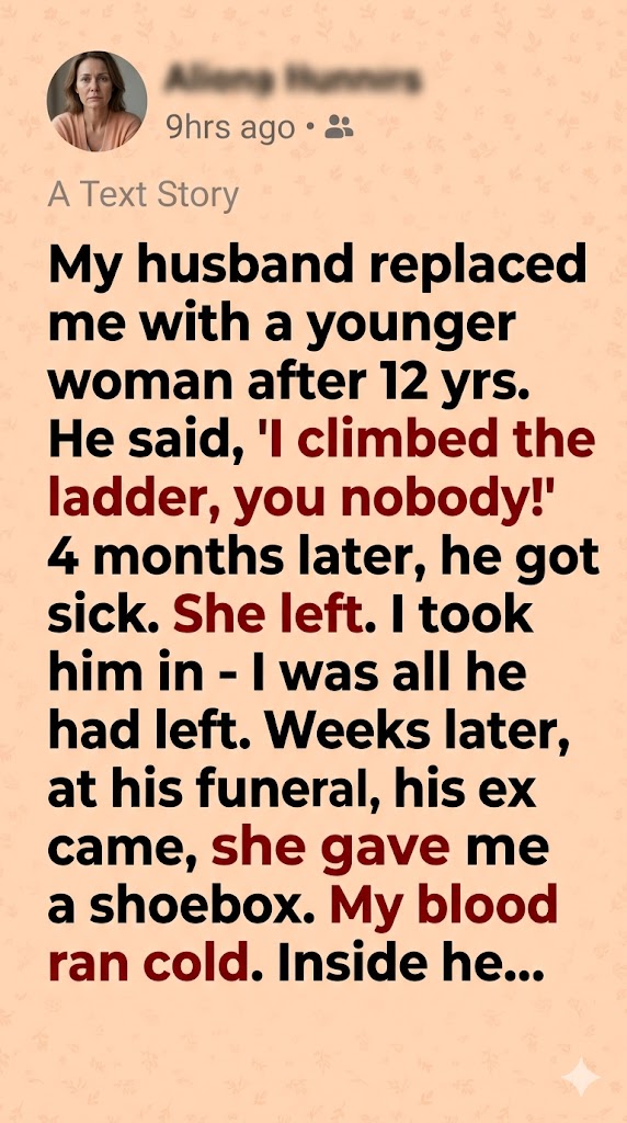 Then I saw her—the woman he left me for. She lingered at the back, unsure, uncomfortable, like she didn’t belong. After the service, she approached me, holding a small shoebox.