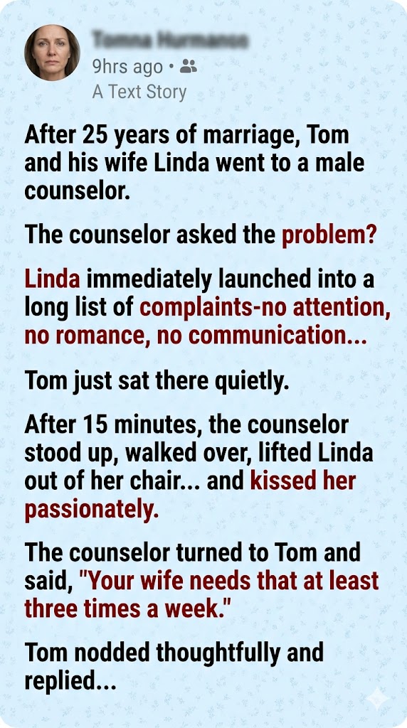 After 25 years of marriage, Tom and his wife Linda went to a male counselor.