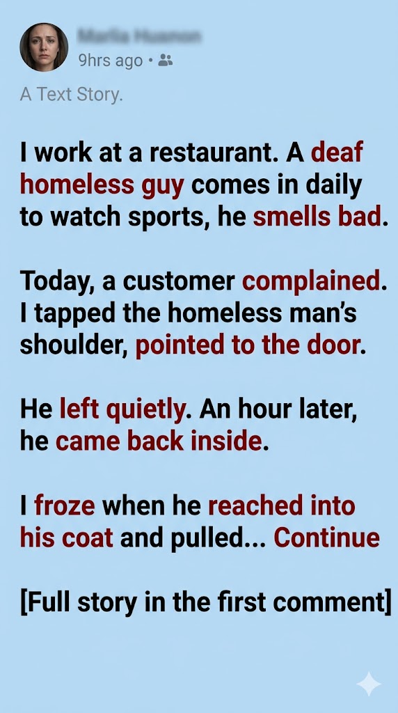 I work at a restaurant, and there’s a deaf homeless man who comes in every day just to watch sports. He has a strong odor, and today, a customer complained. Trying to handle it gently, I pointed him toward the door, and he left without a word.