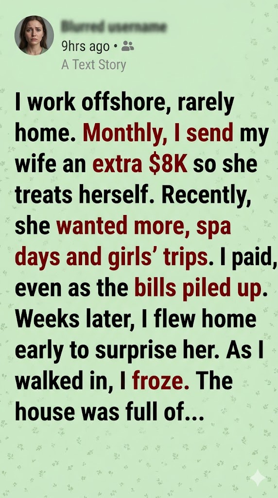 For the past ten years, I’ve worked offshore, three months at a time, enduring long shifts, harsh weather, and relentless exhaustion—all to provide for my family. My wife and I have two daughters, Emma, nine, and Lily, six. Every time I left, I sent her extra money—sometimes $8,000 a month—so she could live comfortably, hire help, and enjoy herself, trusting her completely.